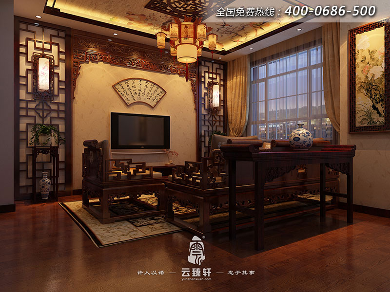 客廳的設計在家具的搭配上,則選用了一些櫻桃木雕花老家具,以求呈現出古色古香的韻味