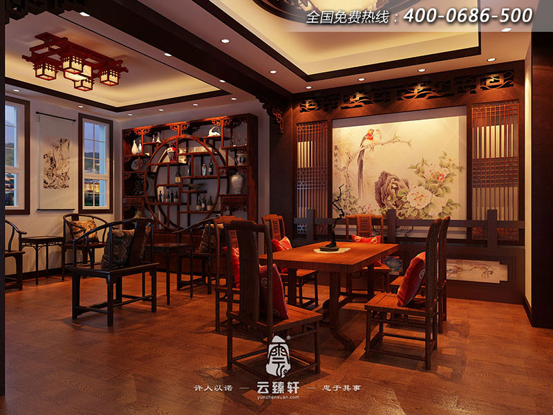 餐廳的鳥語花香水墨畫當做背景墻,再加上桌椅的擺放,整個餐廳中式氣息濃厚,古典的韻味充斥整個空間