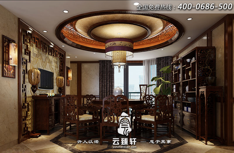 中式古典餐廳裝修不僅全部采用古典家具裝飾,連吊頂都是采用的藻井天花式裝飾,既古典又中式。